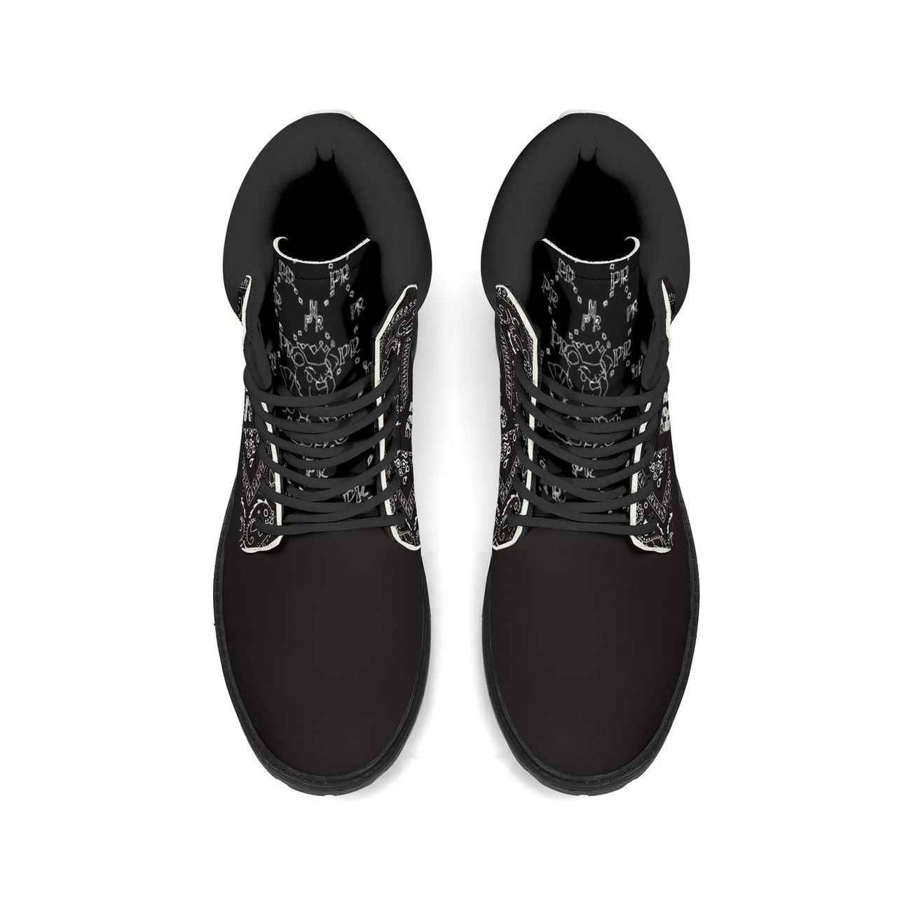 * Custom all over printed boots with lace-up closure and Mid Calf construction for a snug fit.